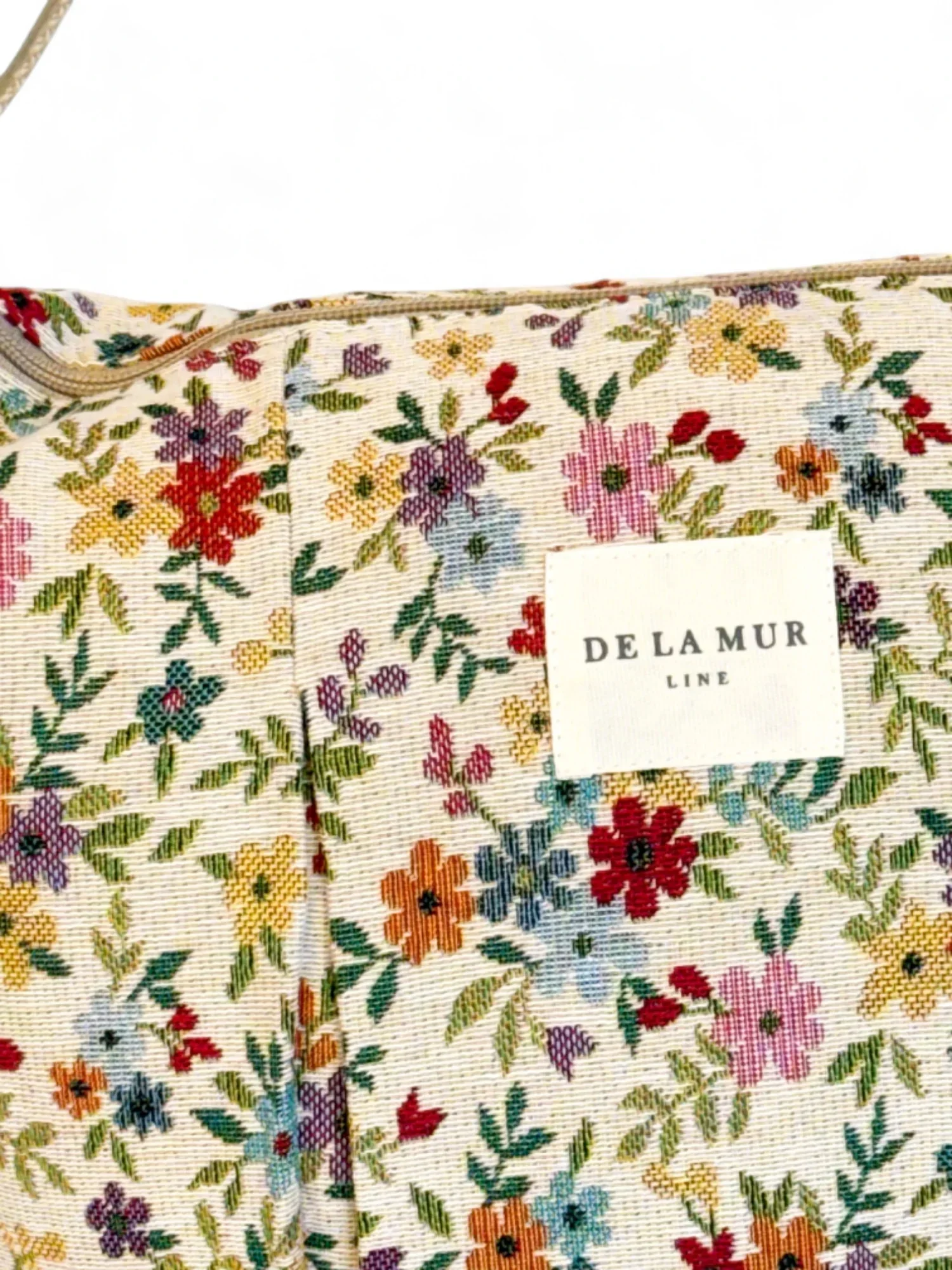 Bolso frunces tipo bandolera con asa larga ajustable de cinta de espiga de algodón de color beige. Cierre superior con cremallera. Con tejido grueso de jacquard con estampado floral sobre fondo beige. Forrado de tejido grueso de color gris en la parte interior. Bolsillo interior con cremallera. Para su correcto mantenimiento se aconseja lavarlo en frío a mano y no utilizar secadora.