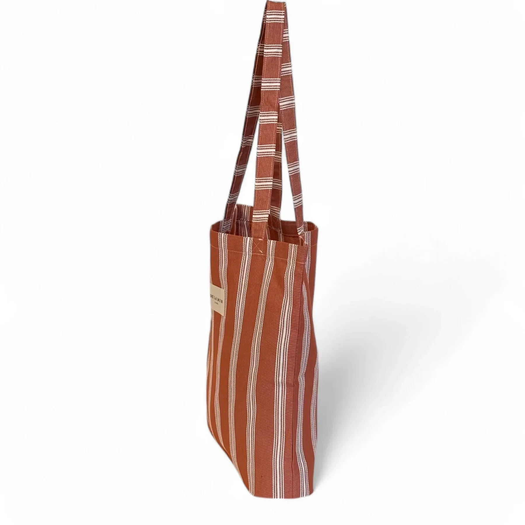 Bolsa "tote bag" con asas para llevar al hombro. Con tejido fino con textura con estampado a rayas de color crudo sobre fondo teja. Para su correcto mantenimiento se aconseja lavarlo en frío y no utilizar secadora.