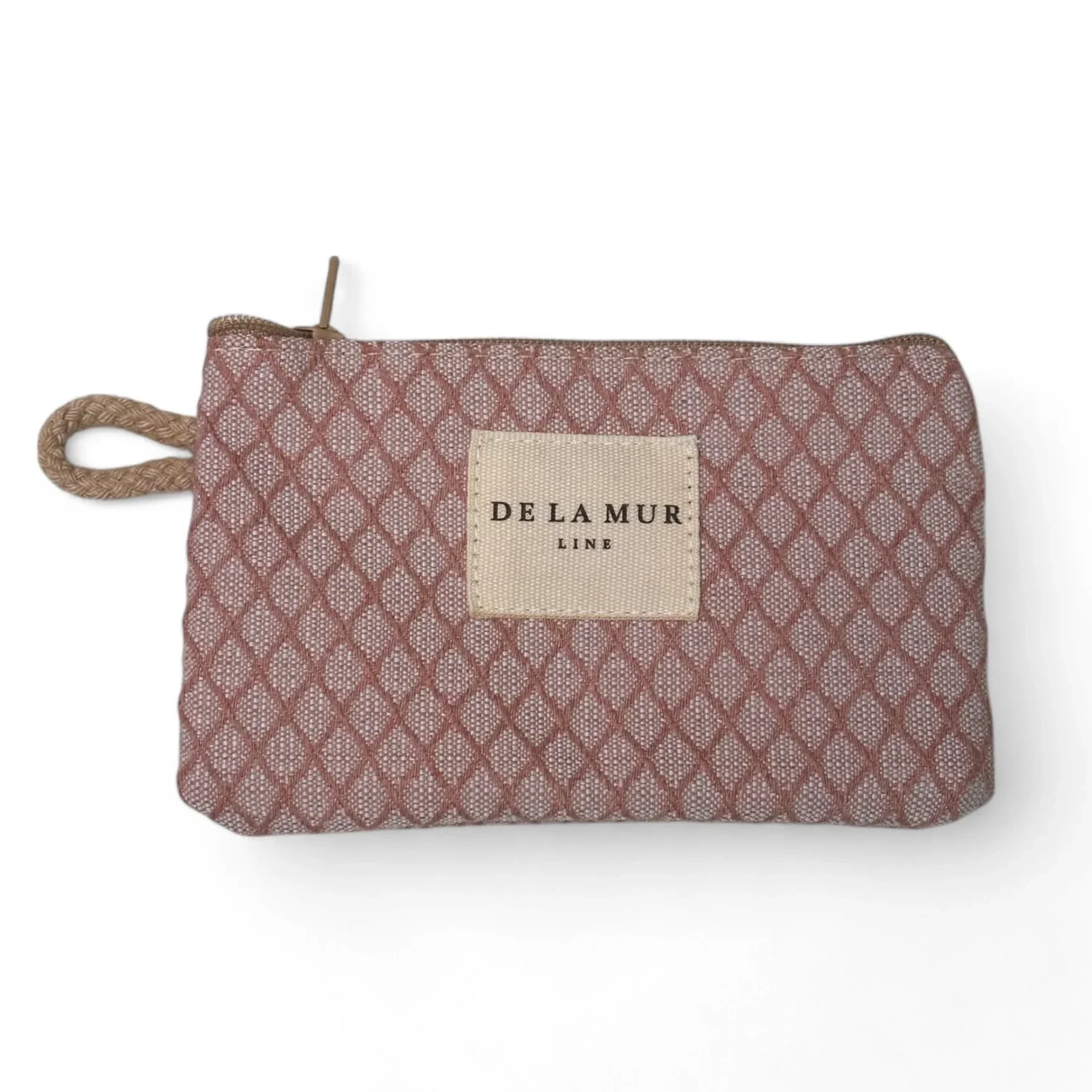 Monedero con cremallera en la parte superior y pequeña asa de cordón de color beige en el lateral. Con tejido fino con textura de color rosa maquillaje. Cada articulo puede tener una variación en el estampado, dependiendo de donde se haya efectuado el corte de la pieza. Forrado de tejido grueso de color gris en la parte interior. Para su correcto mantenimiento se aconseja lavarlo en frío a mano y no utilizar secadora.