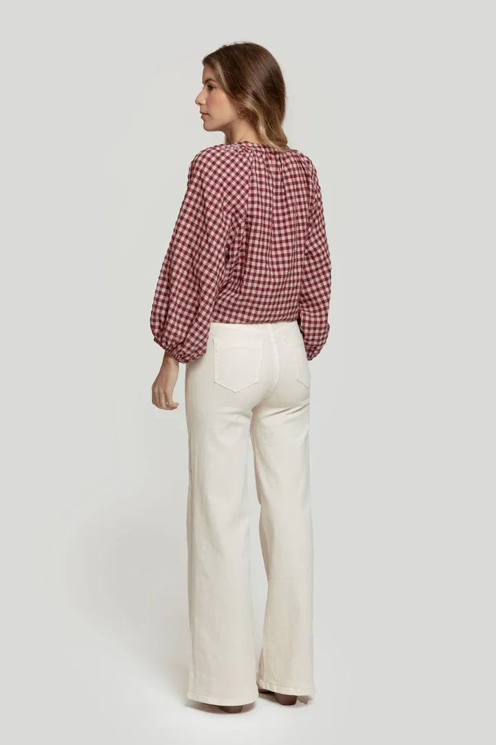 Tejido mezcla de algodón. Diseño recto. Largo normal. Tiro alto. Cinco bolsillos. Cierre de cremallera y botón. Trabillas.