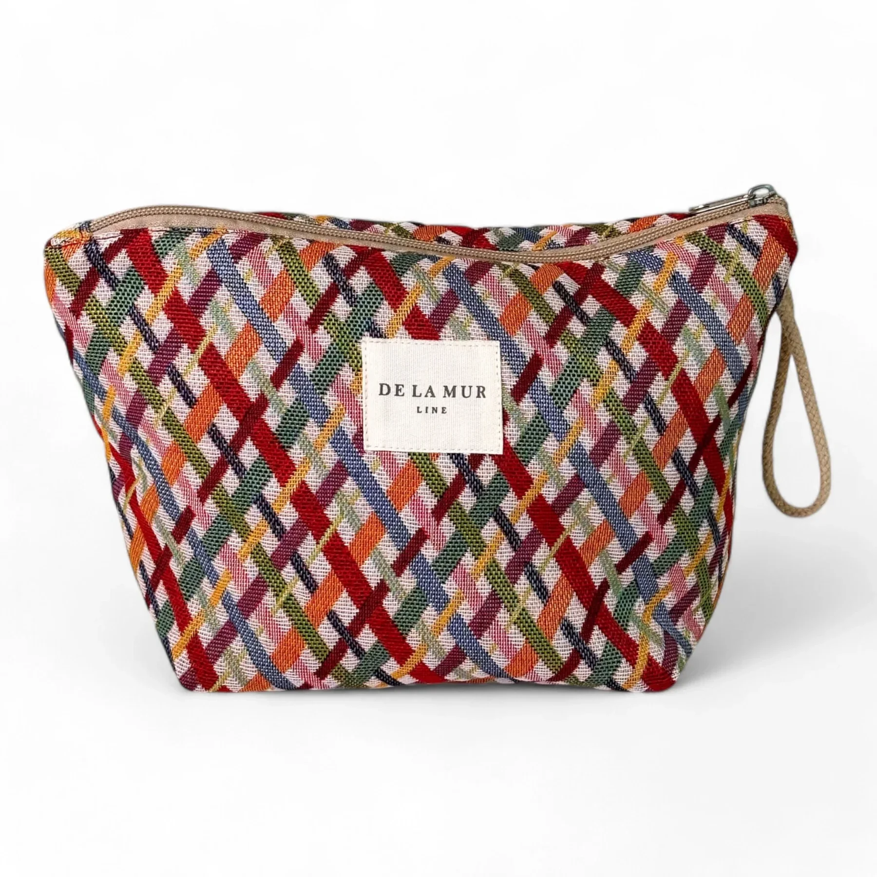 Neceser con cremallera en la parte superior y asa de cordón de color beige en el lateral. Con tejido grueso de jacquard con estampado multicolor. Forrado de tejido grueso de color gris en la parte interior. Para su correcto mantenimiento se aconseja lavarlo en frío a mano y no utilizar secadora.