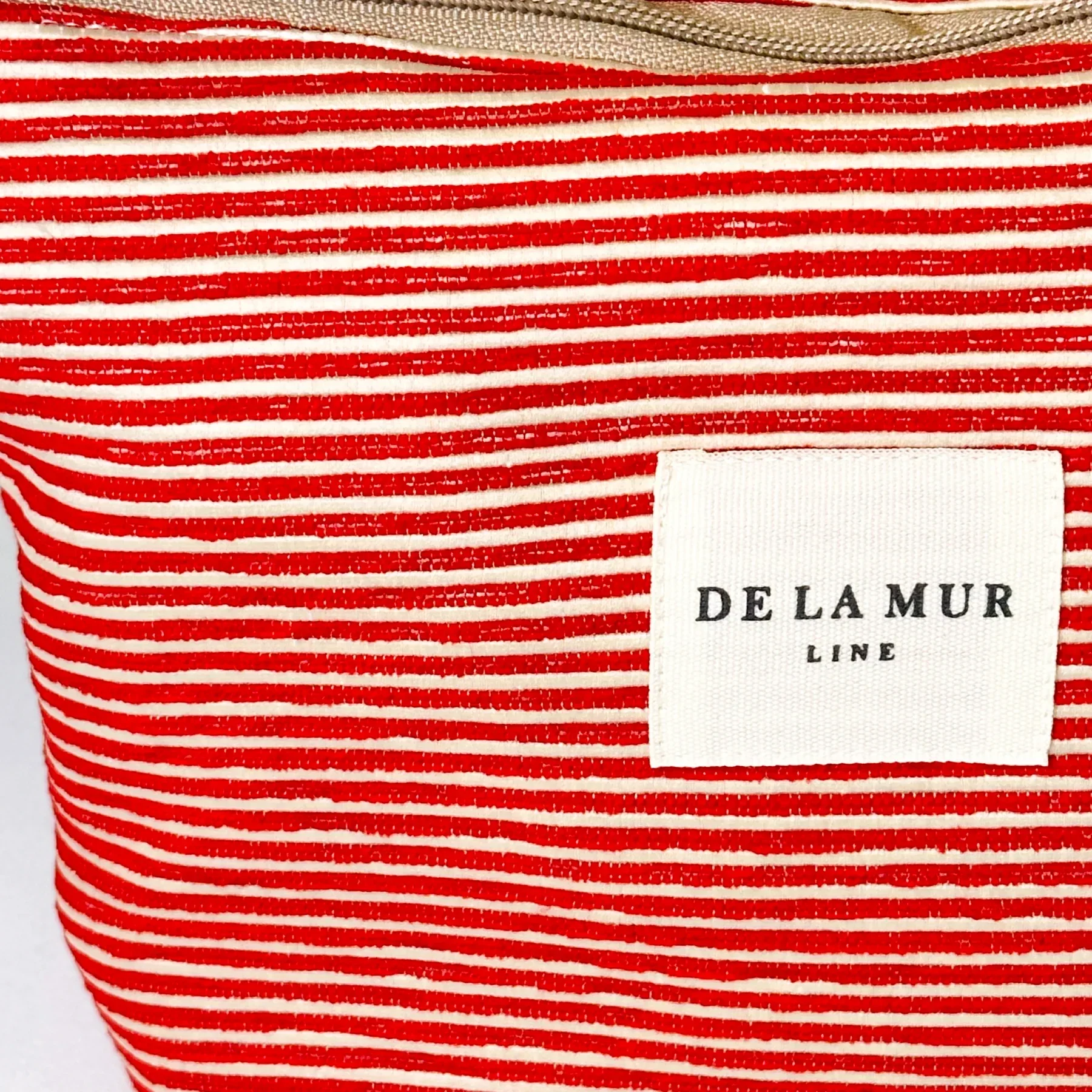 Neceser con cremallera en la parte superior y asa de cordón de color beige en el lateral. Con tejido grueso tapicero de color rojo. Forrado de tejido grueso de color gris en la parte interior. Para su correcto mantenimiento se aconseja lavarlo en frío a mano y no utilizar secadora.