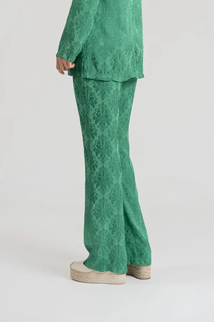 Tejido satinado. Diseño estampado. Diseño fluido. Diseño flare. Tiro alto. Cintura elástica. Perneras amplias.