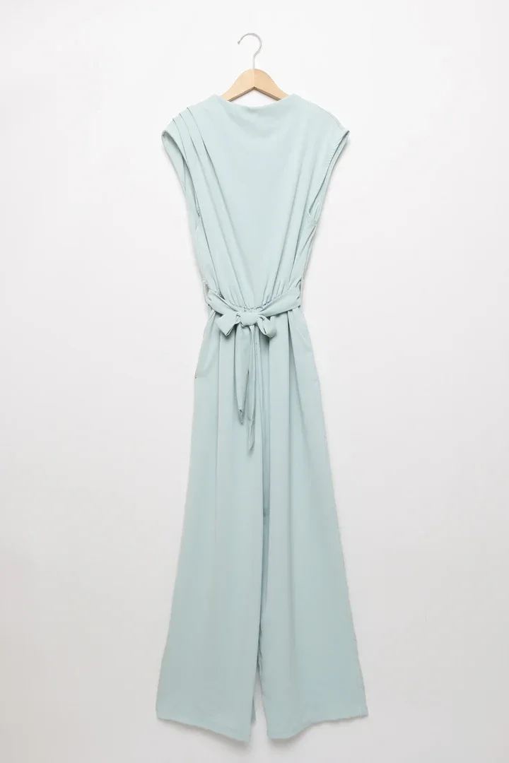 Tejido fluido. Diseño largo. Diseño recto. Escote redondo. Manga sisa. Elástico y abotonado en trasero. Cinturón combinado de mismo tejido.