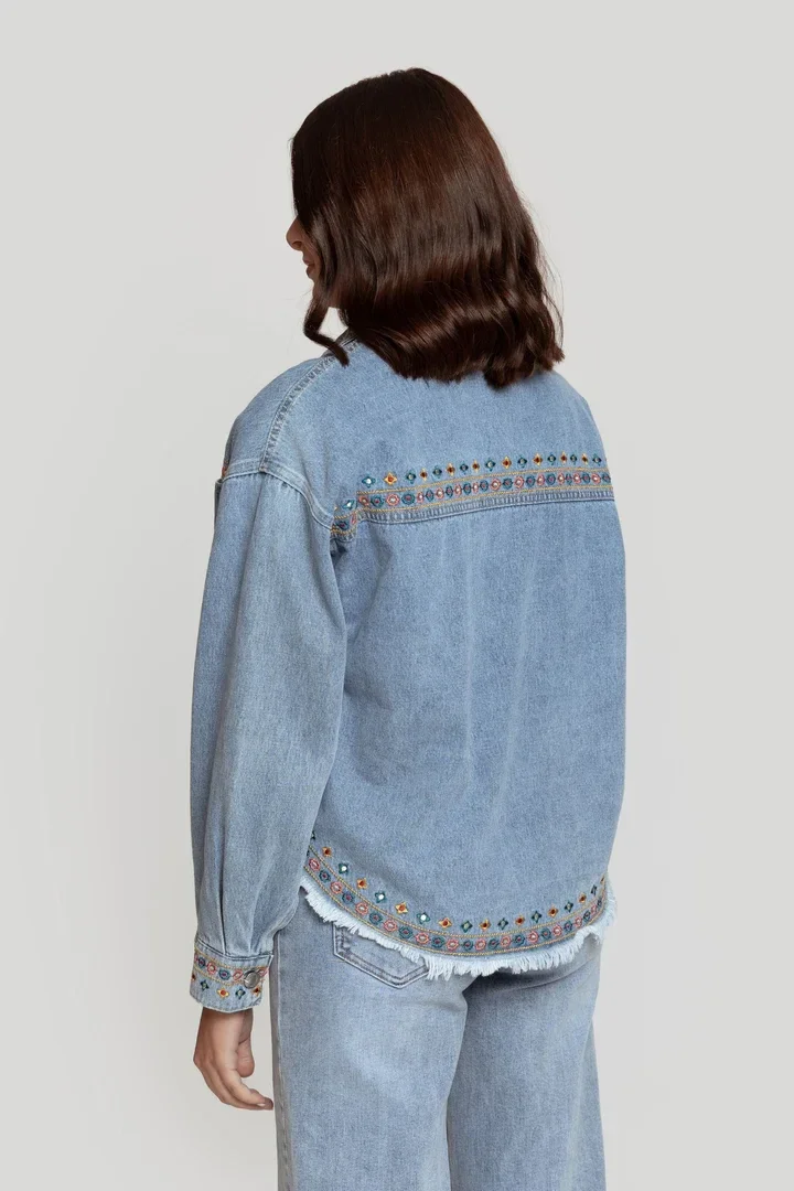 Tejido de algodón. Estilo tejano vaquero. Diseño estampado. Diseño cazadora. Diseño recto. Cuello solapa. Manga larga. Puño abotonado. Dos bolsillos en la parte delantera. Cierre de botones. Bajo sin rematar.