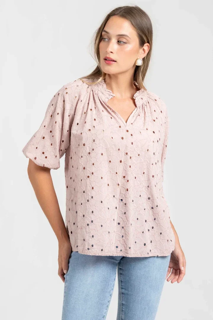 Tejido algodón. Bordados. Cuello pico. Manga corta.