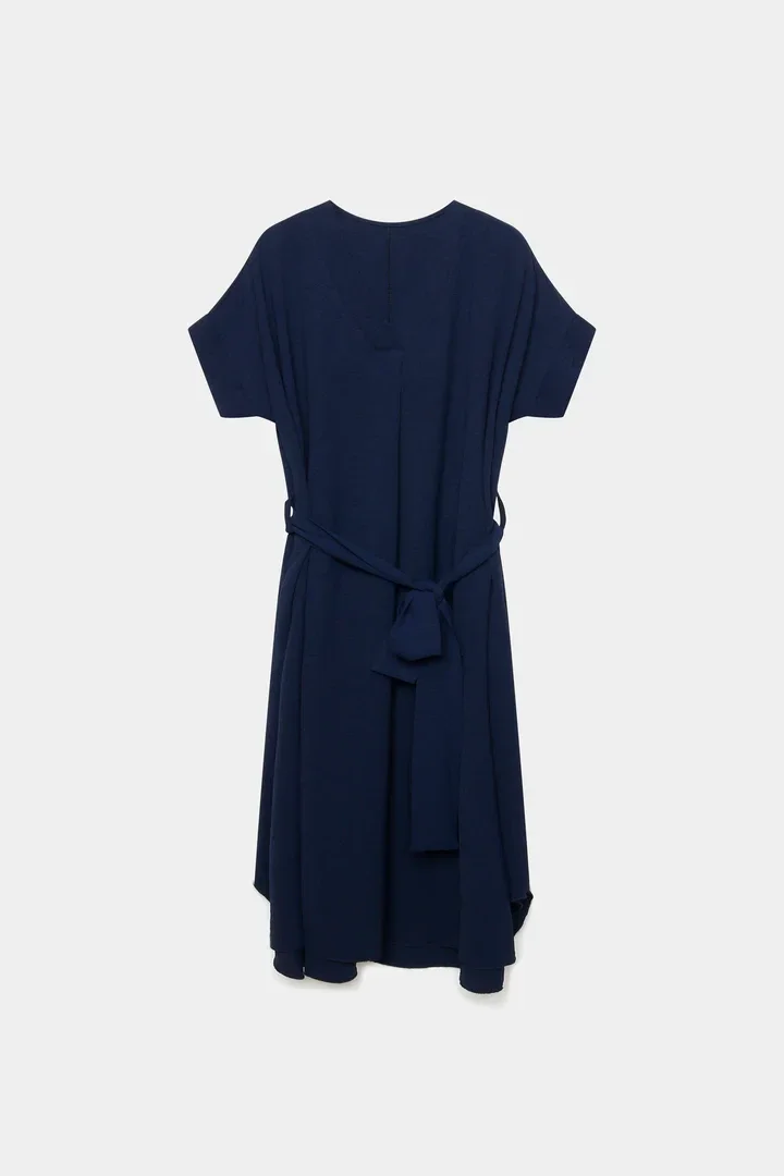 Tejido fluido. Cuello pico. Manga corta. Cinturón combinado de mismo tejido.