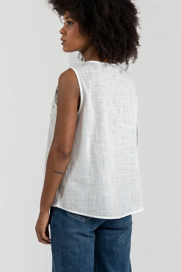 Tejido de algodón. Diseño recto. Cuello pico. Manga sisa. Detalle botón. Talla modelo: M. Altura modelo: 1,65 m.