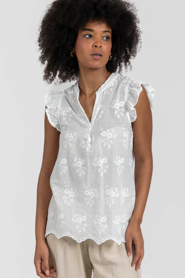 Tejido de algodón. Diseño recto. Cuello redondo. Cuello pico. Manga sisa. Detalles bordados. Acabado festoneado.