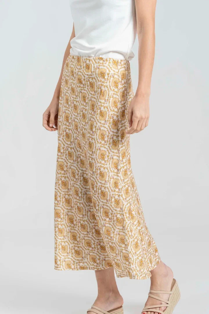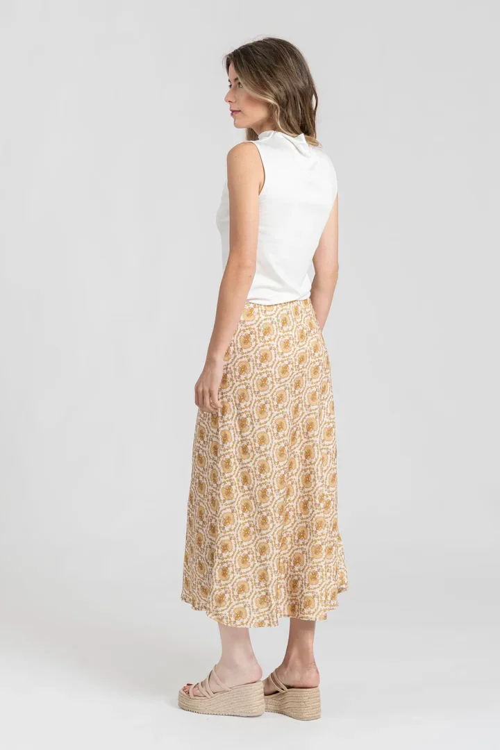 Tejido fluido. Diseño estampado. Diseño vuelo. Diseño midi. Cintura elástica.