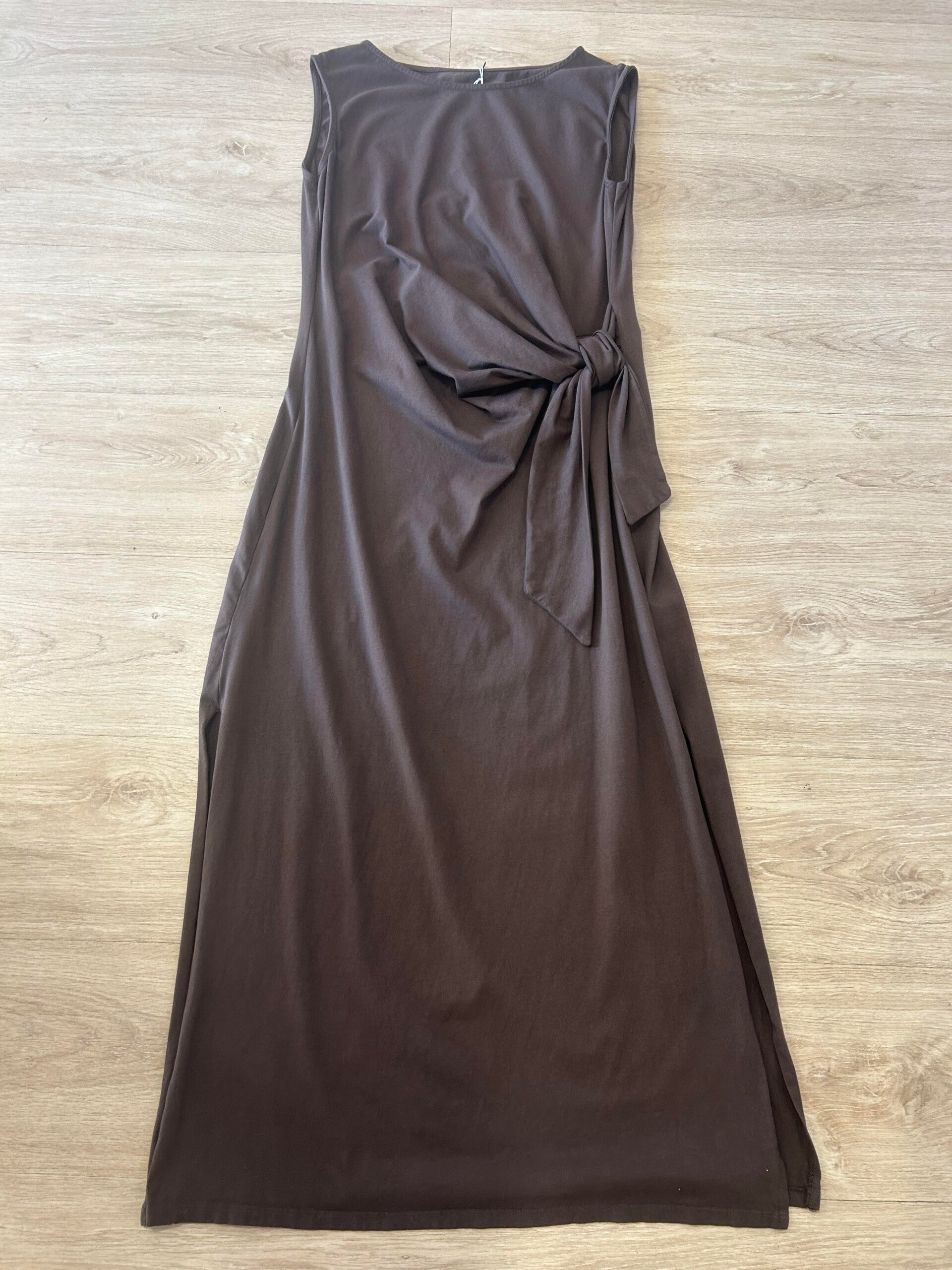 Vestido largo drapeado con lazada a un lateral. Estilo recto con aberturas en el bajo de cada lateral. Con elastano.