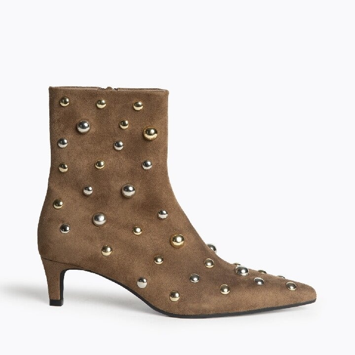 Botín de tacón medio. Detalle de tachas. Acabado en punta. Tacón fino. Cremallera en el lateral interior. Altura de la bota 17 cm. Altura del tacón 5 cm.