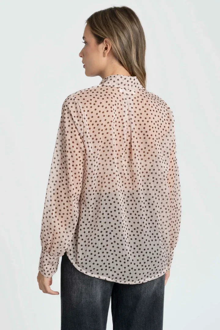 Tejido fluido. Cuello solapa con volantes y manga larga. Cierre frontal con botones.