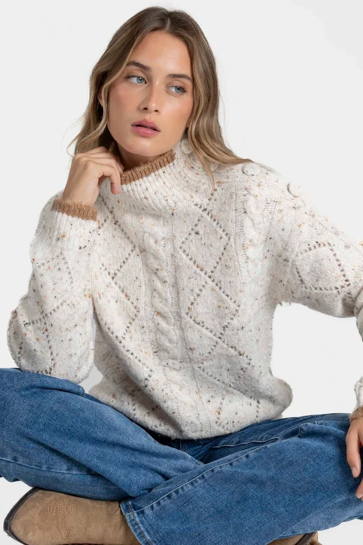 Descripción: tejido de punto. Cuello redondo subido. Manga larga. Detalle color a contraste. Botones en el hombro.