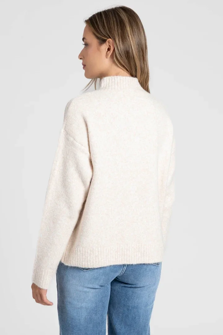 Descripción: tejido punto. Cuello subido con botones bordados. Manga larga. Acabados rib.