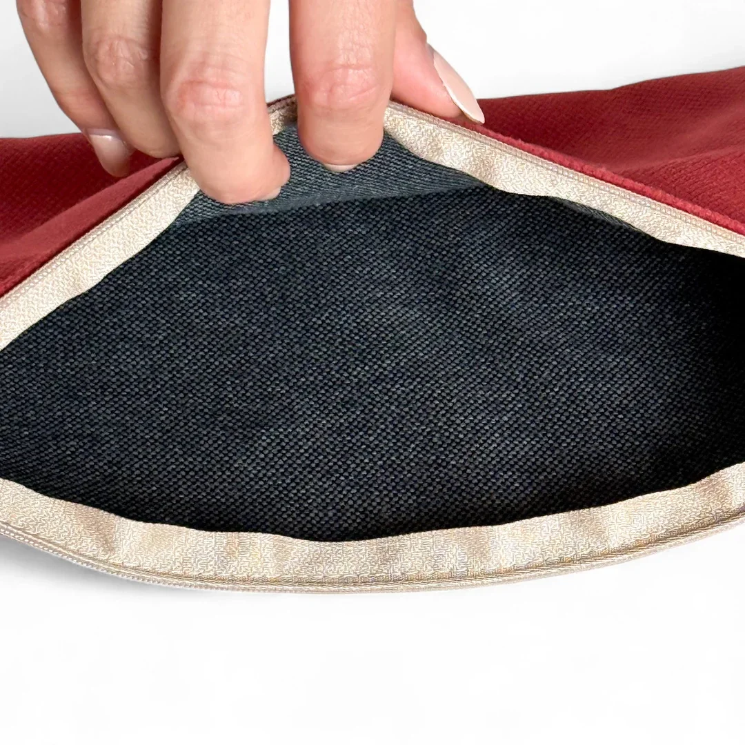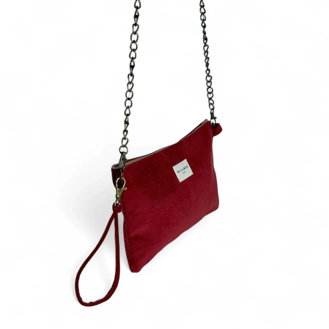 Bolso tipo "Clutch" con asa de cadena de color oro viejo y con asa pequeña en el lateral extraíble para llevar en la muñeca. Con tejido grueso de terciopelo de color granate. Con forro interior y cremallera en la parte superior. Para su correcto mantenimiento se aconseja lavarlo en frío y no utilizar secadora.
