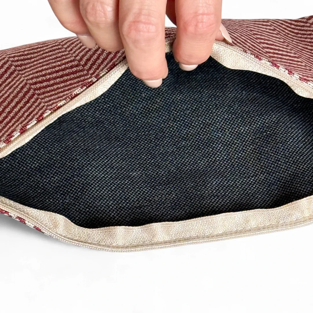 Bolso tipo "Clutch" con asa de cadena de color oro viejo y con asa pequeña en el lateral extraíble para llevar en la muñeca. Con tejido grueso de jacquard con estampado de espiga de color granate. Con forro interior y cremallera en la parte superior. Para su correcto mantenimiento se aconseja lavarlo en frío y no utilizar secadora.