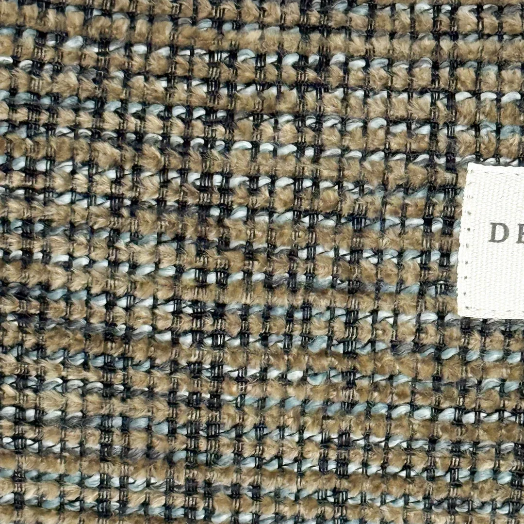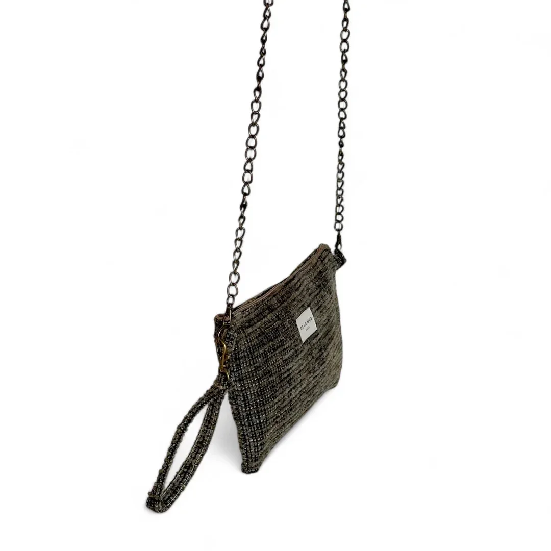 Bolso tipo "Clutch" con asa de cadena de color oro viejo y con asa pequeña en el lateral extraíble para llevar en la muñeca. Con tejido grueso tapicero de color verde caqui. Con forro interior y cremallera en la parte superior. Para su correcto mantenimiento se aconseja lavarlo en frío y no utilizar secadora.