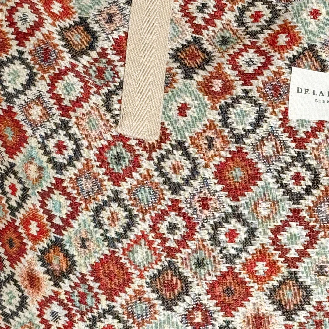 Bolsa de fin de semana con asas medianas en la parte superior de cinta de espiga de algodón de color beige. Con tejido grueso de jacquard con estampado multicolor. Bolsillo interior con cremallera. Forrado de tejido grueso de color gris en la parte interior. Para su correcto mantenimiento se aconseja lavarlo en frío a mano y no utilizar secadora.