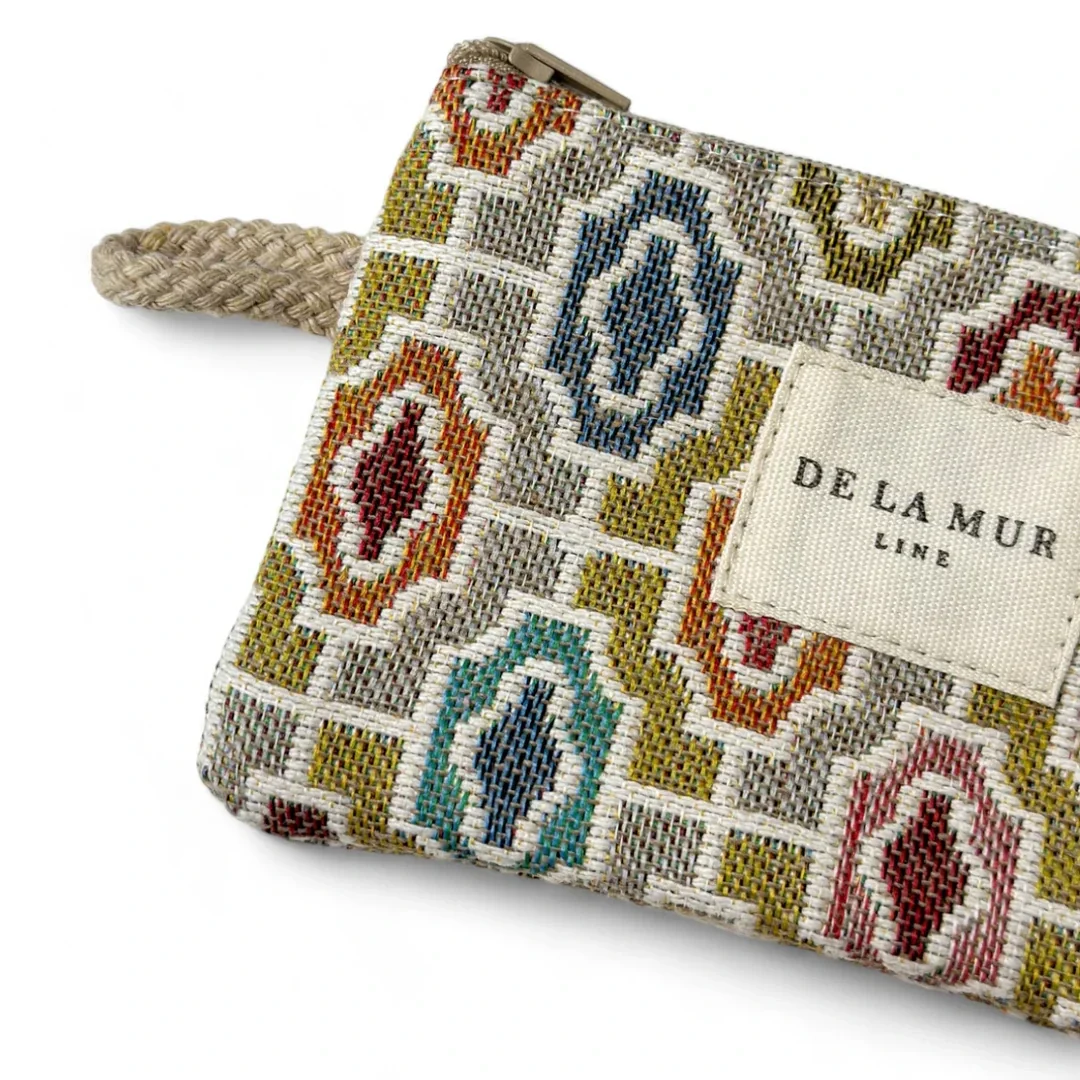 Monedero con cremallera en la parte superior y pequeña asa de cordón de color beige en el lateral. Con tejido grueso de jacquard con estampado geométrico en tonos beige, rosa y azul. Cada articulo puede tener una variación en el estampado, dependiendo de donde se haya efectuado el corte de la pieza. Forrado de tejido grueso de color gris en la parte interior. Para su correcto mantenimiento se aconseja lavarlo en frío a mano y no utilizar secadora.