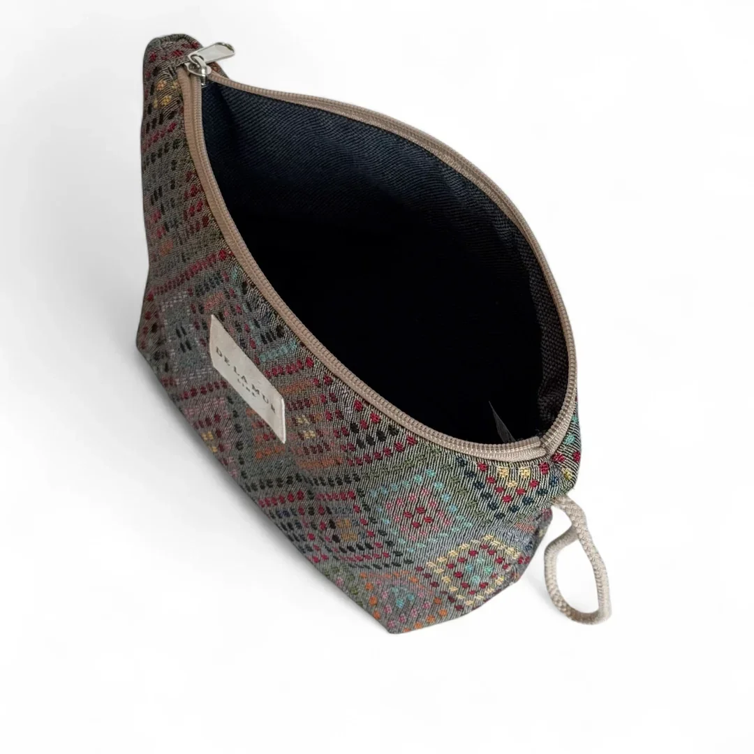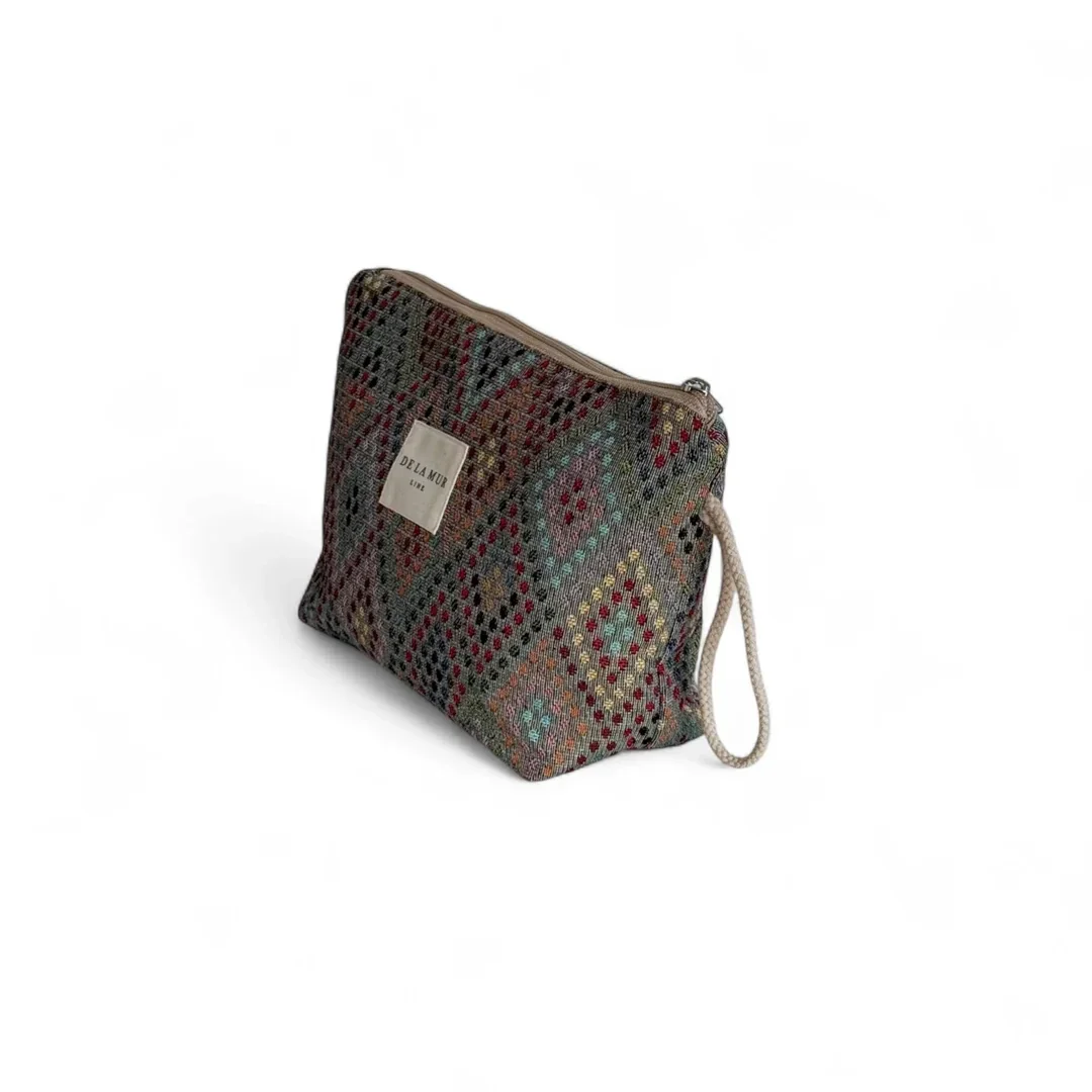 Neceser con cremallera en la parte superior y asa de cordón de color beige en el lateral. Con tejido grueso de jacquard con estampado geométrico multicolor sobre fondo gris. Forrado de tejido grueso de color gris en la parte interior. Para su correcto mantenimiento se aconseja lavarlo en frío a mano y no utilizar secadora.