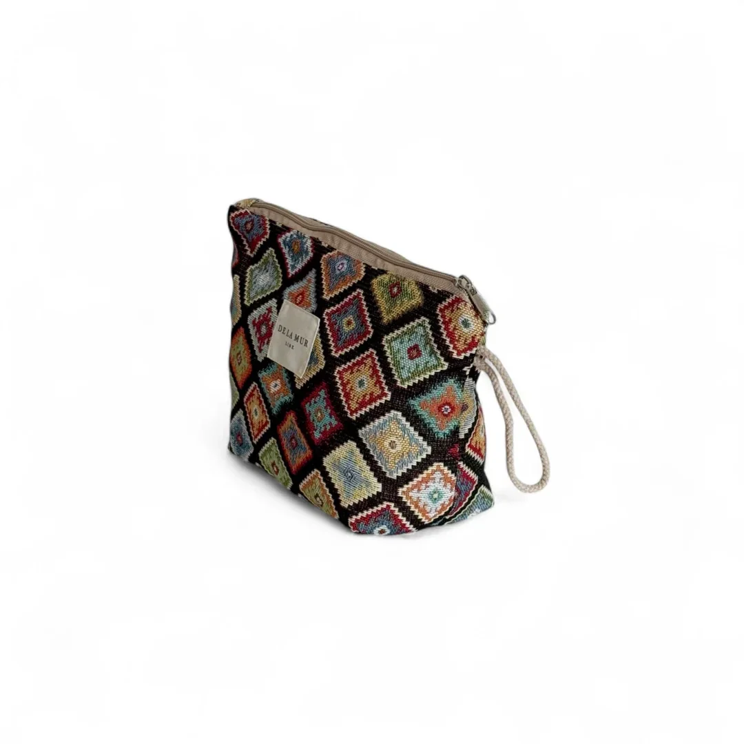 Neceser con cremallera en la parte superior y asa de cordón de color beige en el lateral. Con tejido grueso de jacquard con estampado geométrico tipo croche multicolor. Forrado de tejido grueso de color gris en la parte interior. Para su correcto mantenimiento se aconseja lavarlo en frío a mano y no utilizar secadora.