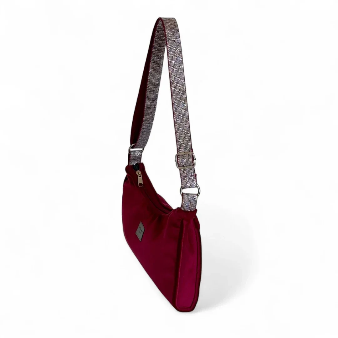 Bolso pequeño con asa larga ajustable. Con un tejido de terciopelo de color burdeos. Opción de llevarlo al hombro o como bandolera. Bolsillo interior con cremallera. Asa de cinta de algodón de color burdeos con lurex plateado en una cara. Etiqueta de marca de polipiel plateada. Para su correcto mantenimiento se aconseja lavarlo en frío a mano y no utilizar secadora.