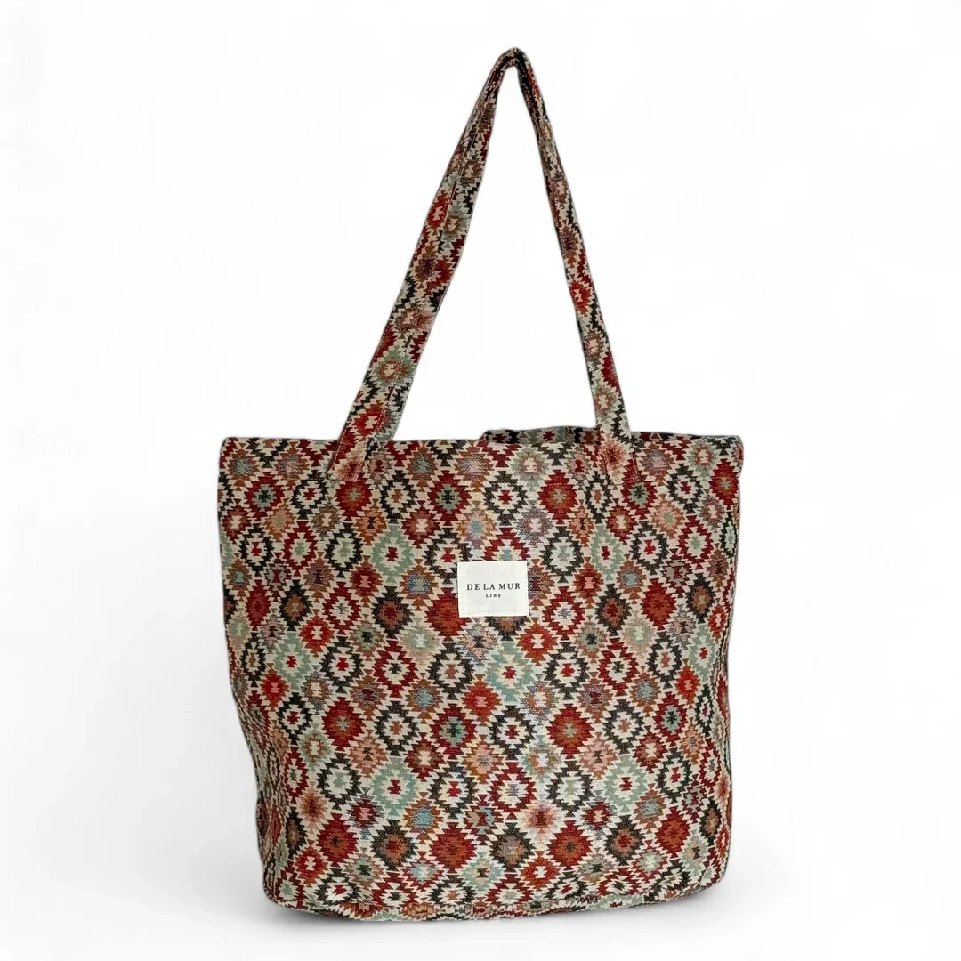 Bolsa shopper grande con asas para llevar al hombro. Con tejido grueso de jacquard con estampado geométrico multicolor. Para su correcto mantenimiento se aconseja lavarlo en frío a mano y no utilizar la secadora.