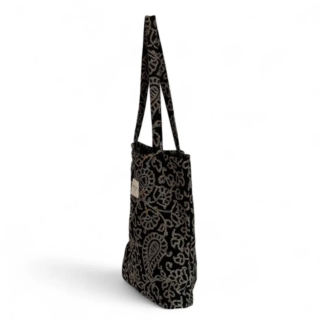 Bolsa "tote bag" con asas para llevar al hombro. Con tejido grueso de jacquard con estampado floral de color gris sobre fondo negro. Para su correcto mantenimiento se aconseja lavarlo en frío y no utilizar secadora.